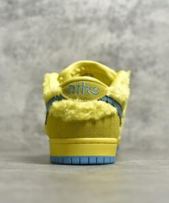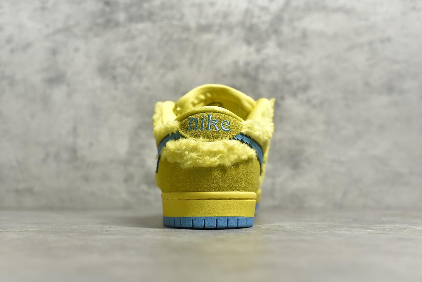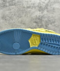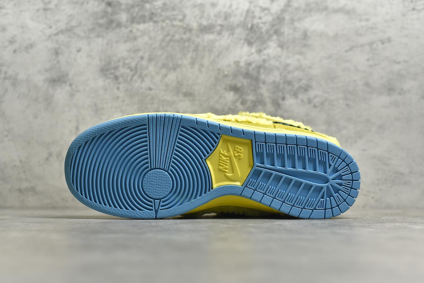 The upper combines fuzzy yellow faux fur with tonal suede overlays, echoing the playful and psychedelic aesthetic of the band’s legacy. A bright blue Swoosh with jagged stitching cuts across the sides, mimicking the bear’s fur outline. Inside the tongue, a hidden stash pocket adds utility and nods to counterculture roots. A bold blue outsole and matching sockliner complete the vibrant look.