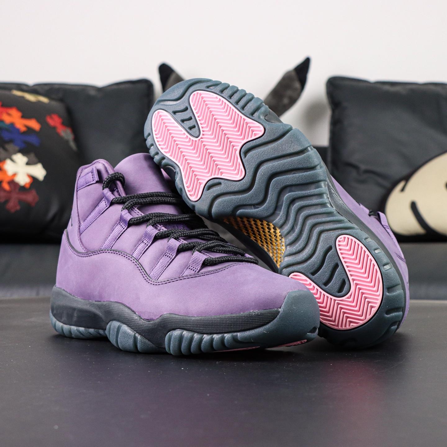 Jordan 11 Las Vegas reps come in a purple suede upper. The material feels soft and has a matte look. No patent leather here, just suede all around. The shape is still AJ11. Nothing changed there. Black midsole. Dark translucent outsole. Pink traction pods on the bottom. Easy to tell once you flip the shoe over. This pair is more about color. Deep purple, very heavy look. Not shiny, not loud. Shape and materials stay close to a 1:1 build.